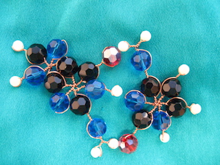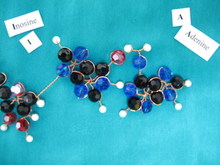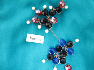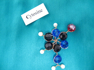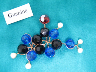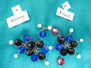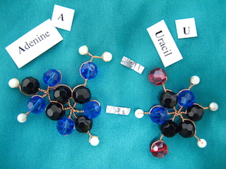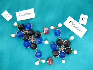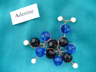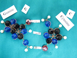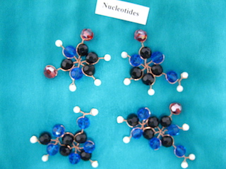 Some nucleotides and hydrogen-bonds, for DNA (yes I made them with beads, copper and crystals):